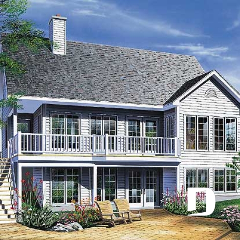 Plan de maison genre chalet avec plafond cathédrale, suite des maîtres, grande terrasse, sous-sol à aménager