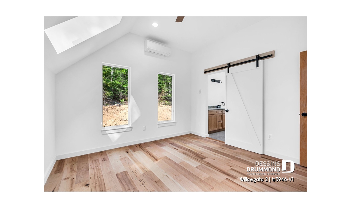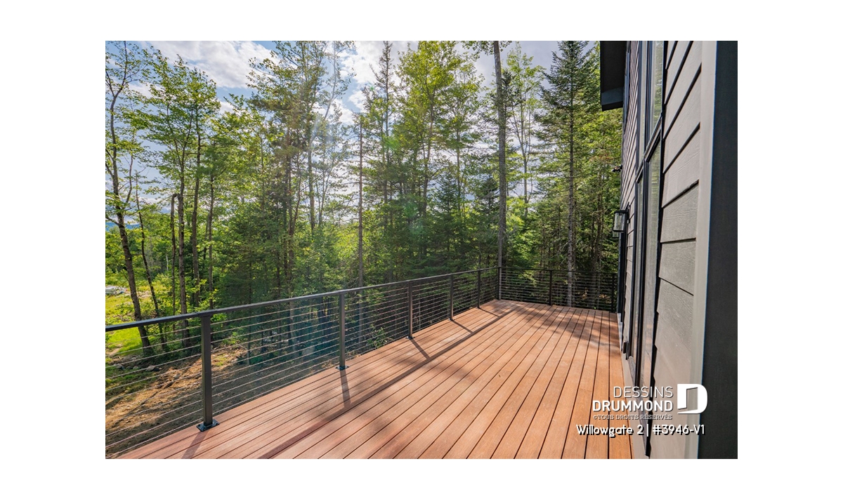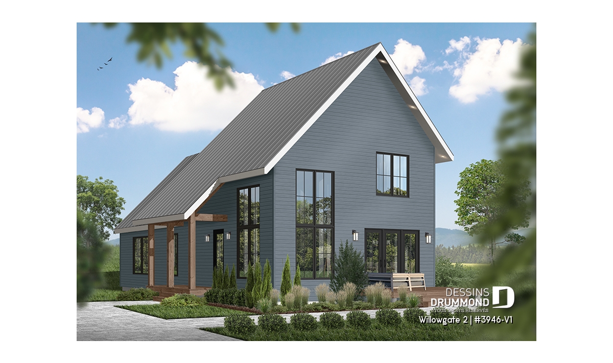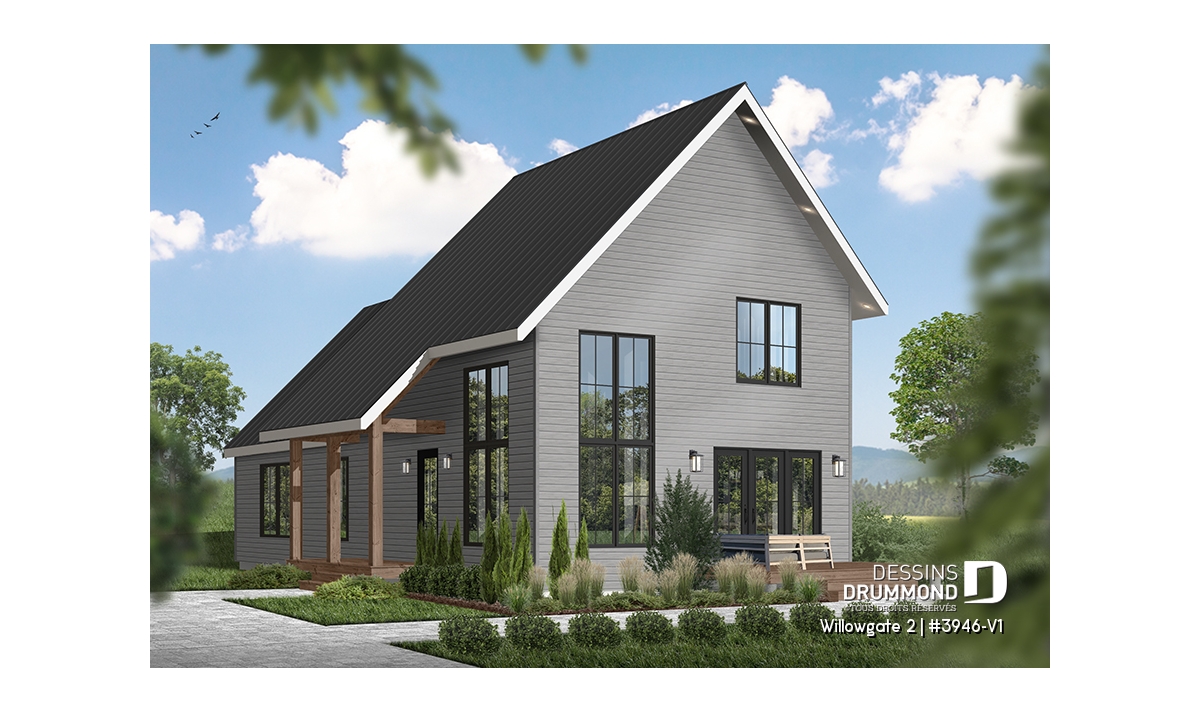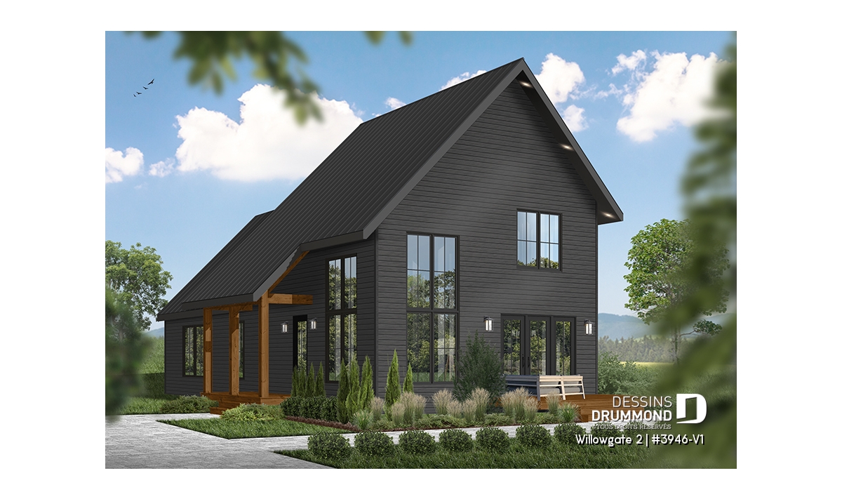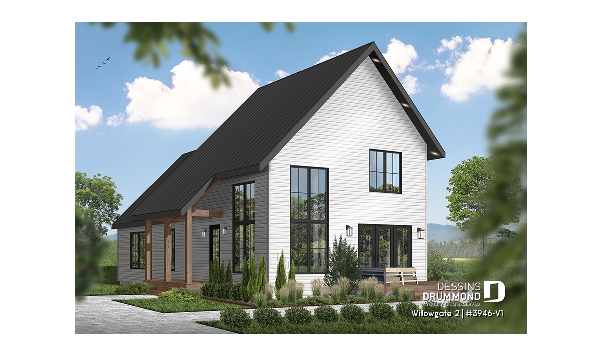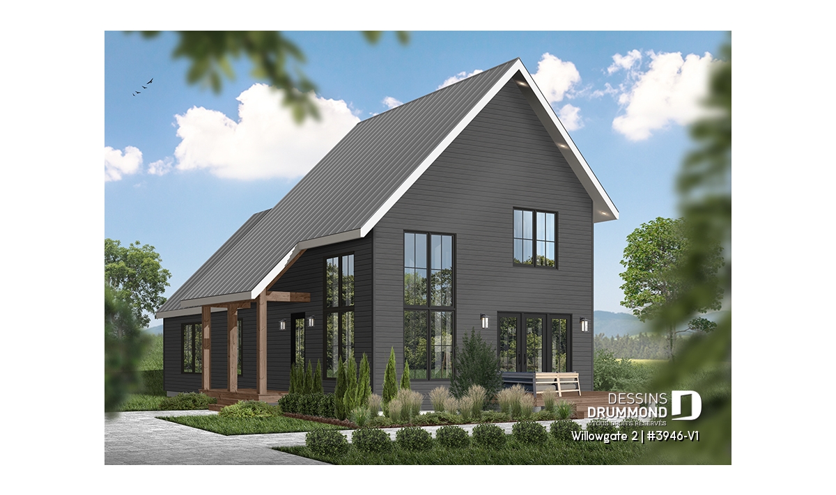 Le plan de maison WILLOWGATE 2 (#3946-V1), un chalet moderne de 3 chambres, style scandinave, propose 1 512 pieds carrés avec une fenestration abondante. Le plafond cathédrale partiel dans la salle de séjour et dans la suite des parents, en offre encore d’avantage en termes de luminosité.