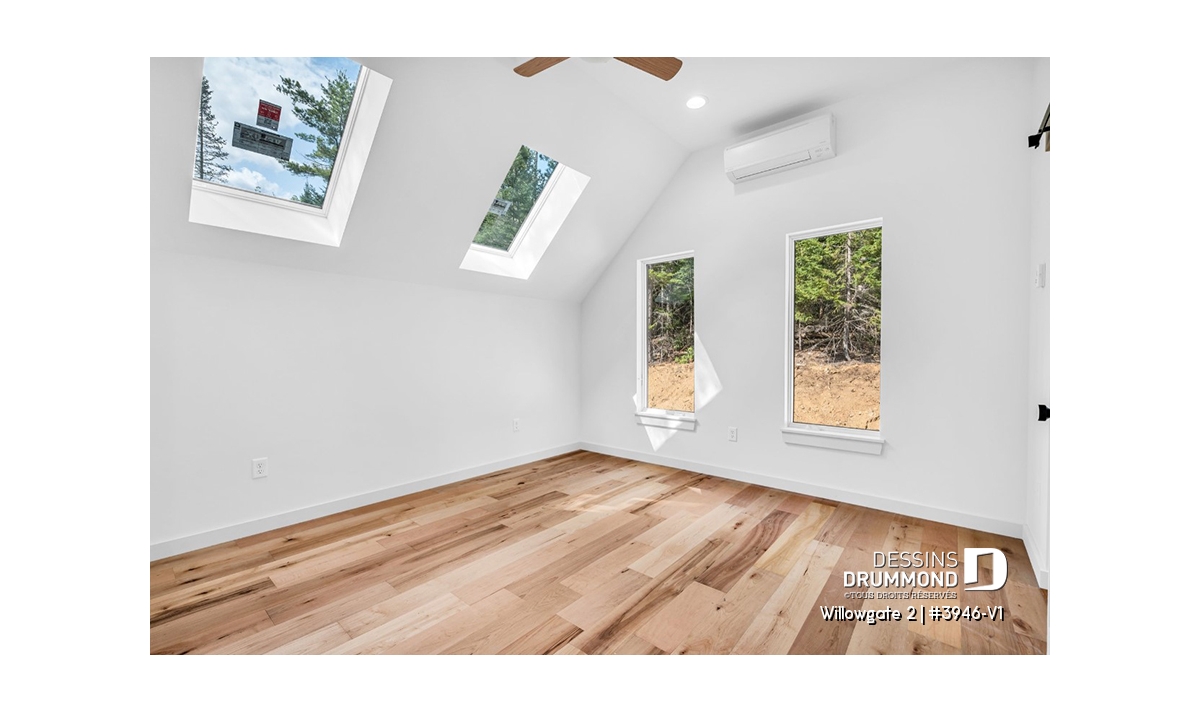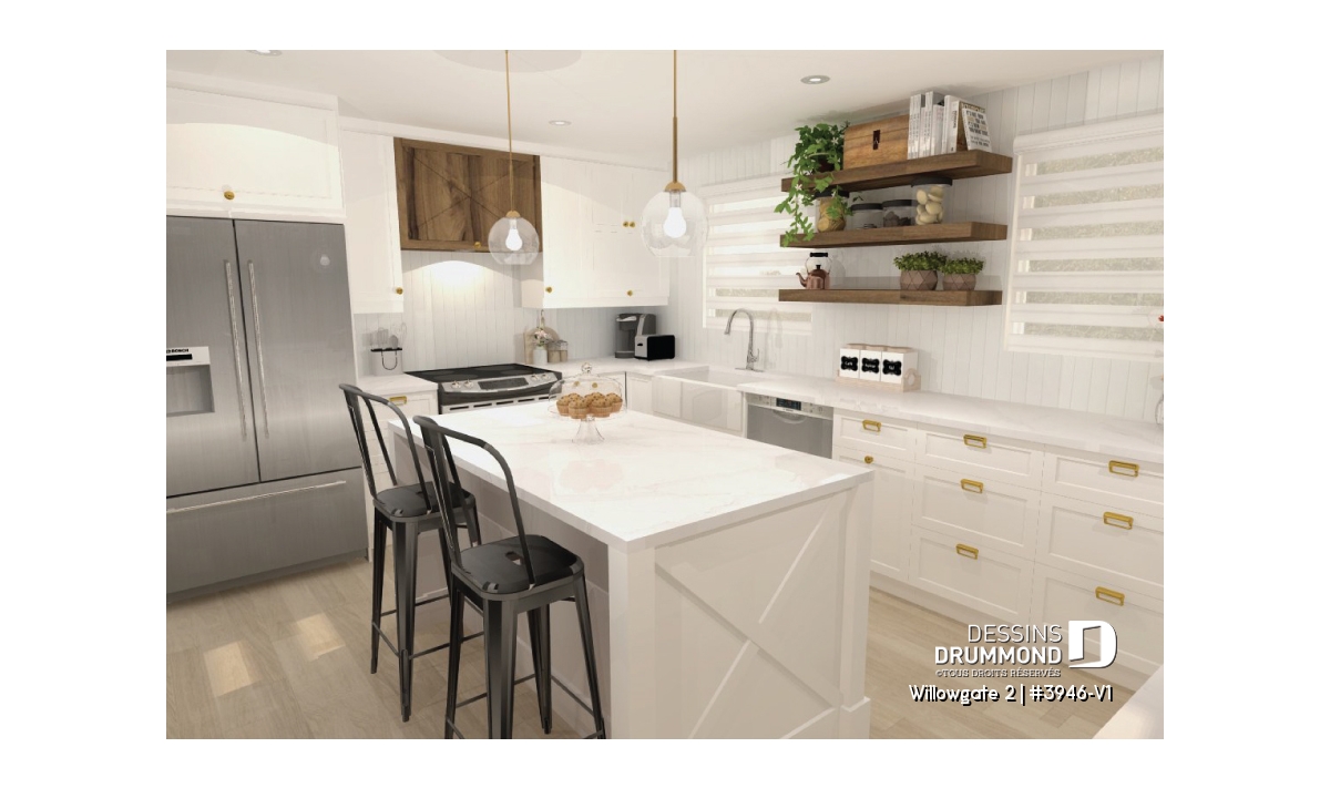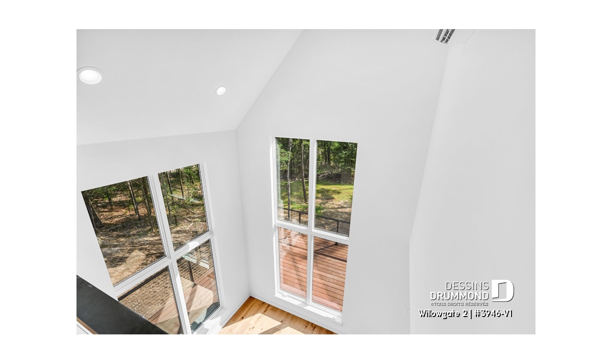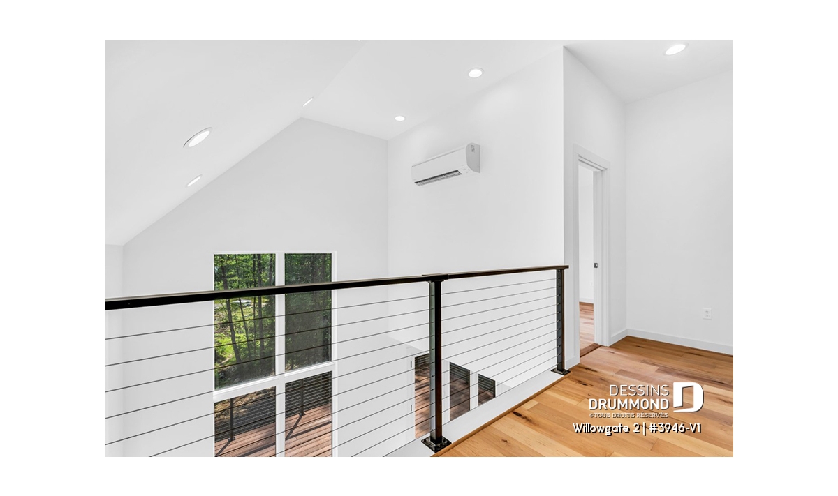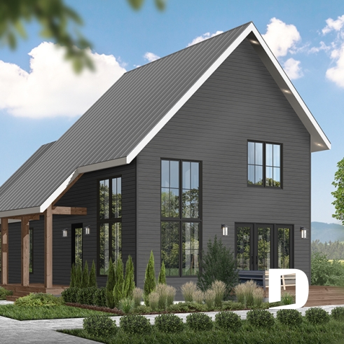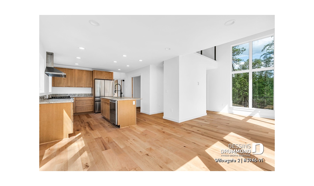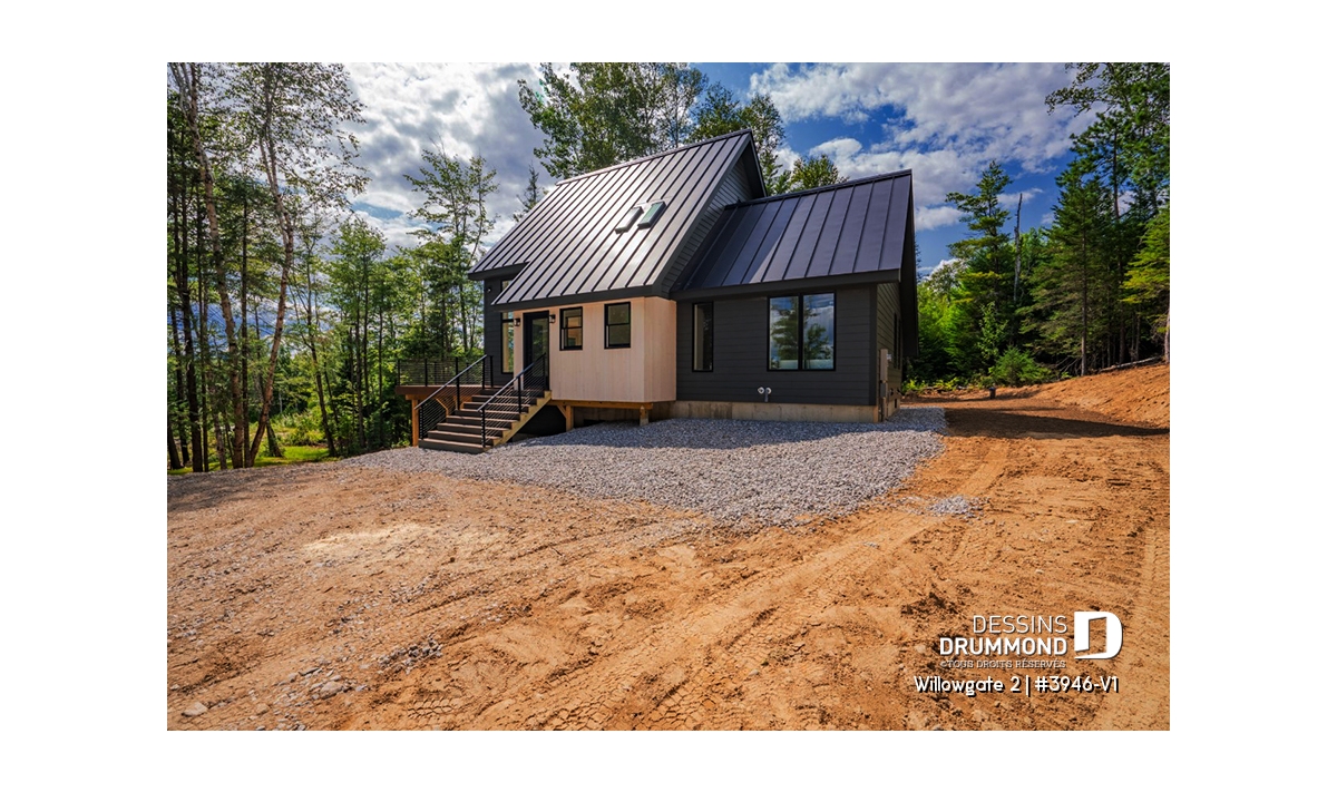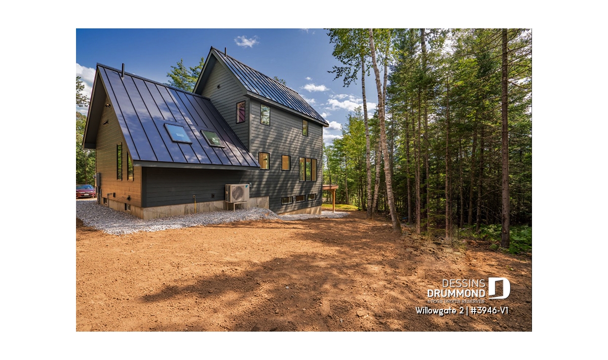 Le plan de maison WILLOWGATE 2 (#3946-V1), un chalet moderne de 3 chambres, style scandinave, propose 1 512 pieds carrés avec une fenestration abondante. Le plafond cathédrale partiel dans la salle de séjour et dans la suite des parents, en offre encore d’avantage en termes de luminosité.