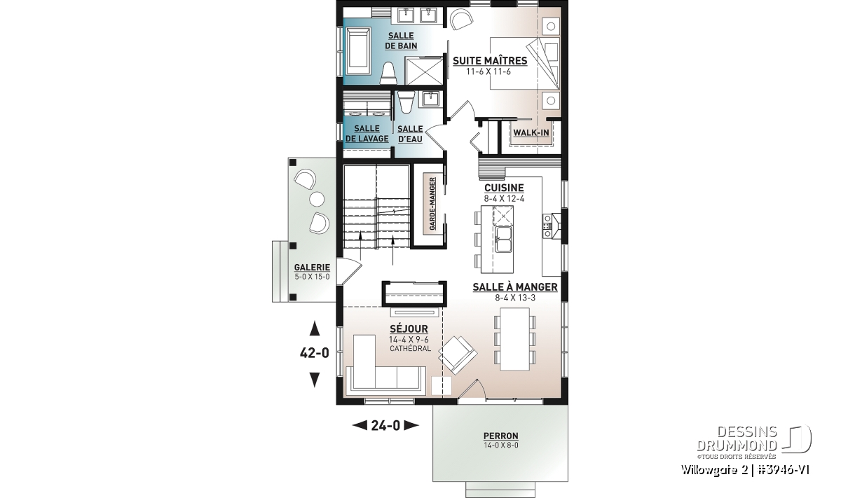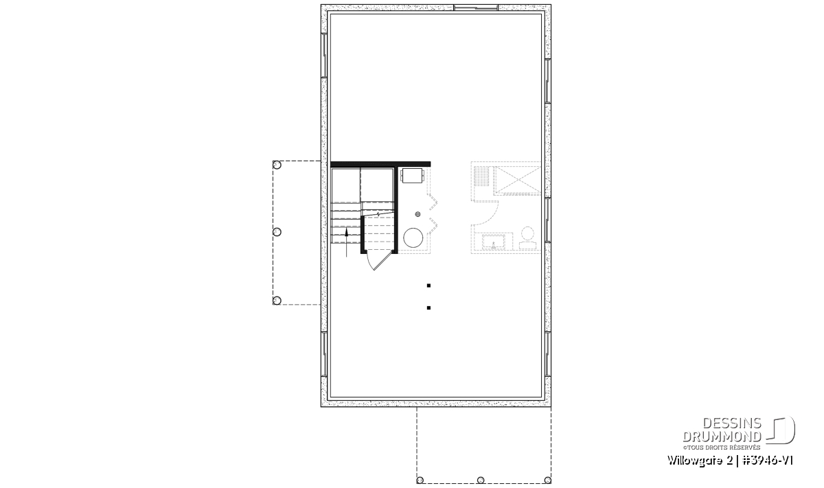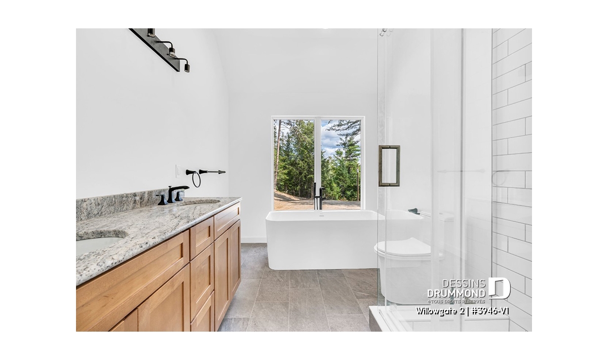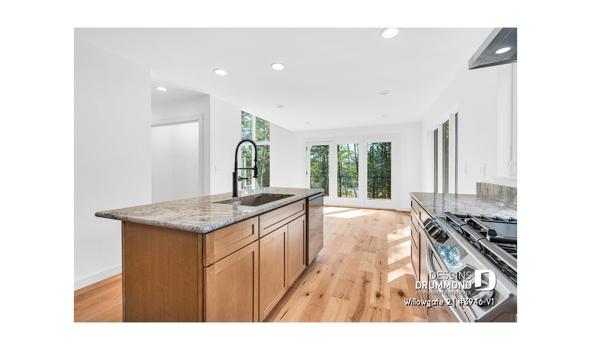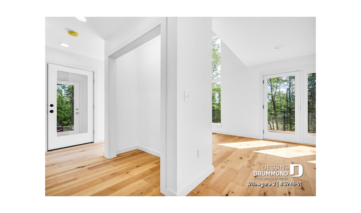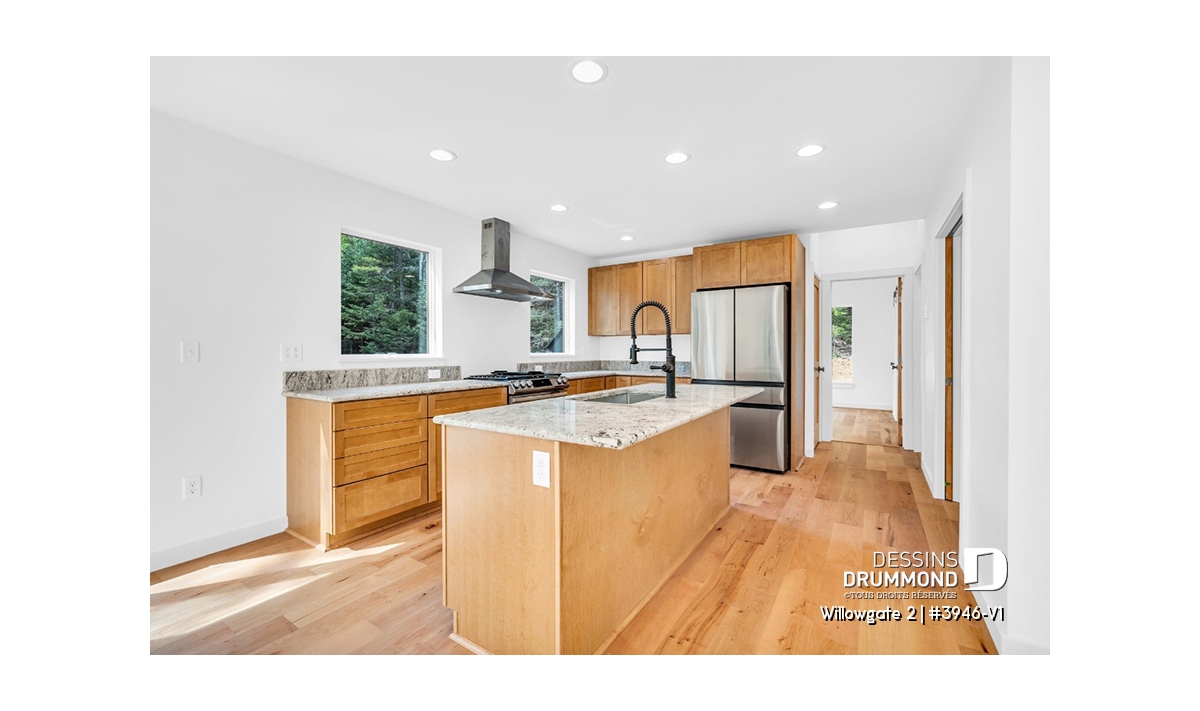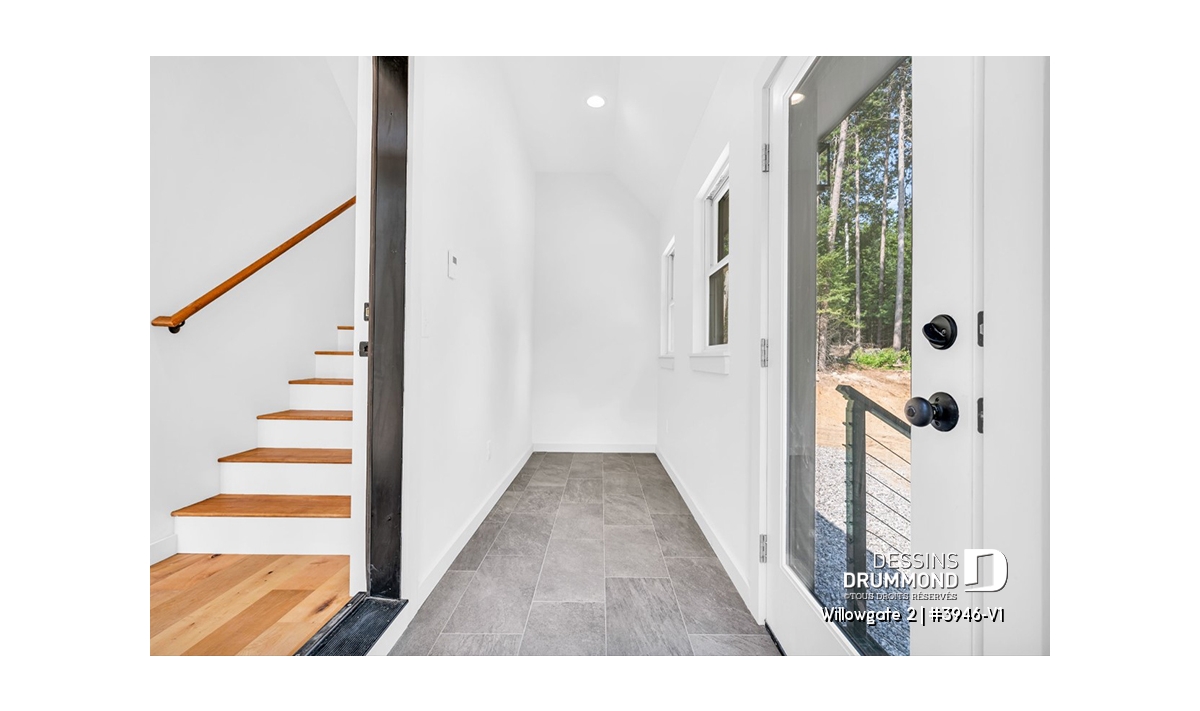 Le plan de maison WILLOWGATE 2 (#3946-V1), un chalet moderne de 3 chambres, style scandinave, propose 1 512 pieds carrés avec une fenestration abondante. Le plafond cathédrale partiel dans la salle de séjour et dans la suite des parents, en offre encore d’avantage en termes de luminosité.