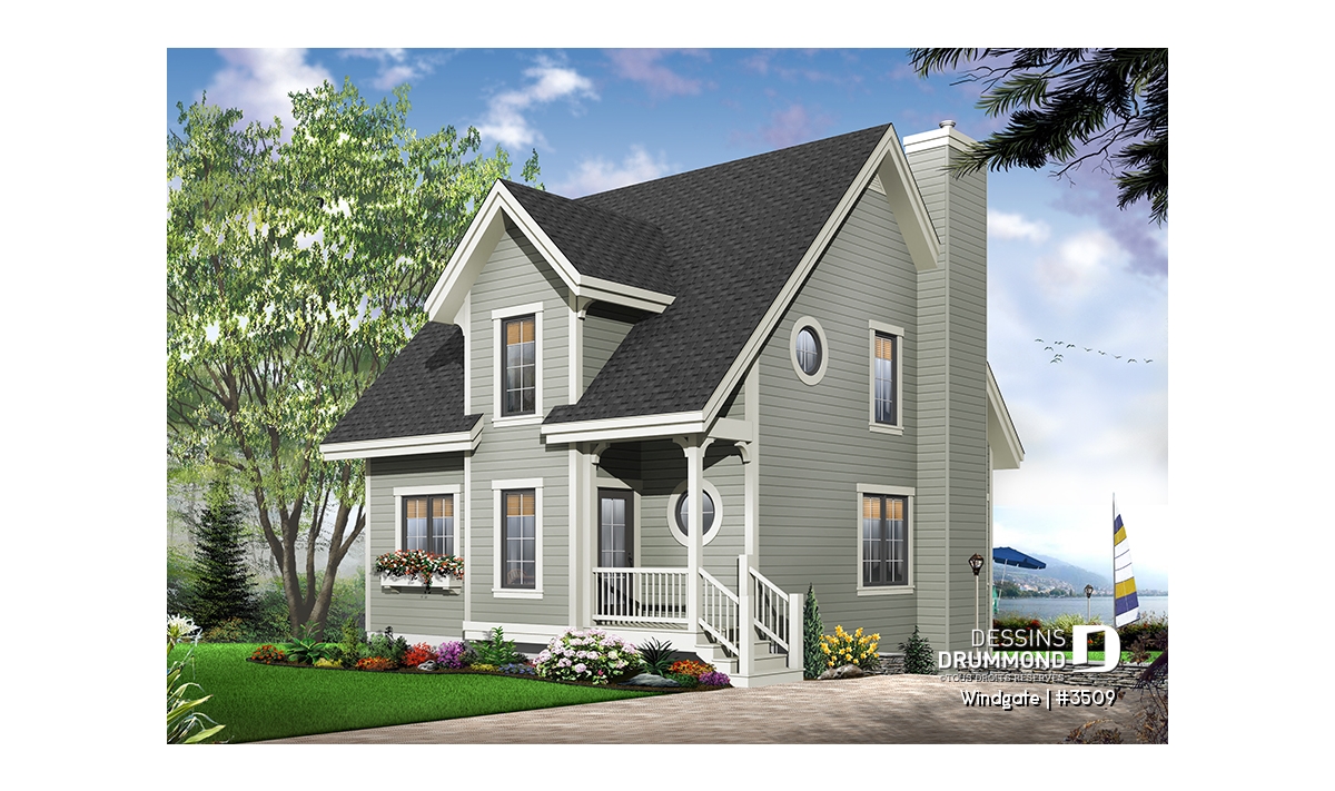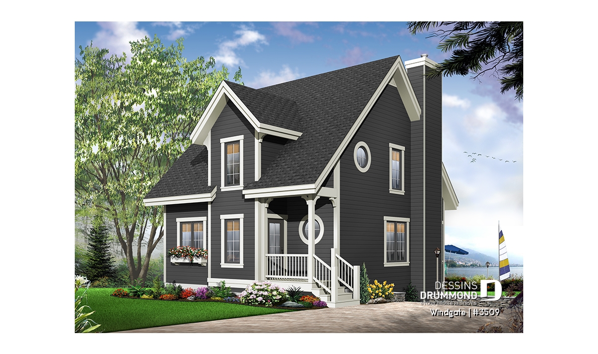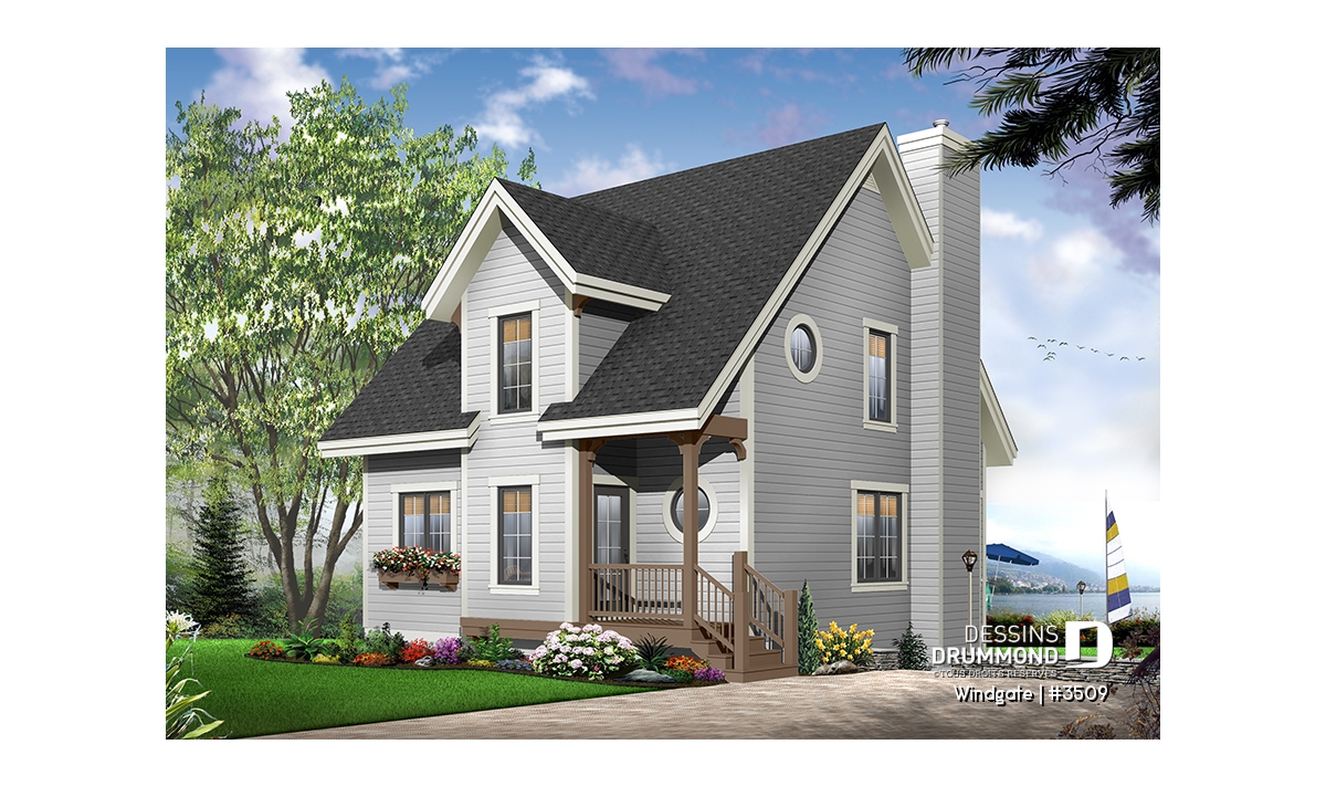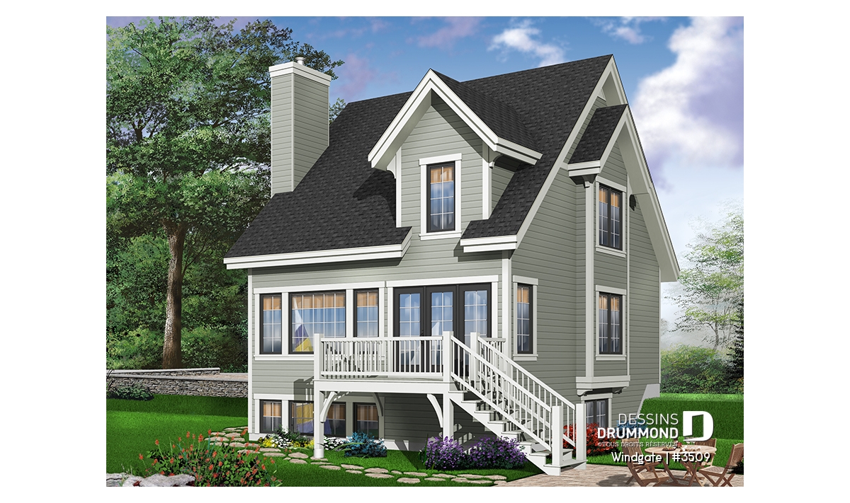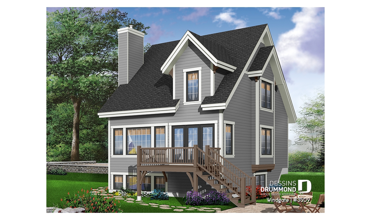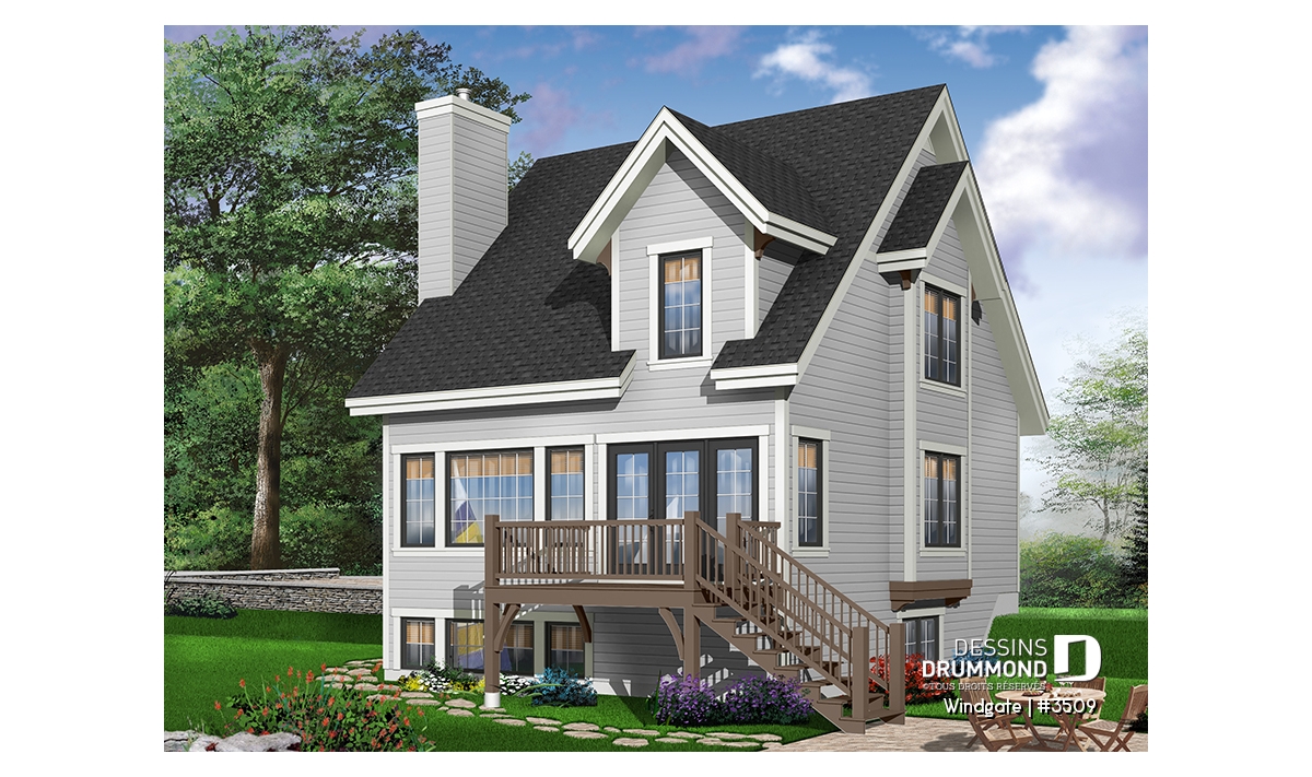 Plan de petite maison champêtre avec vue panoramique, 3 chambres, foyer, aire ouverte